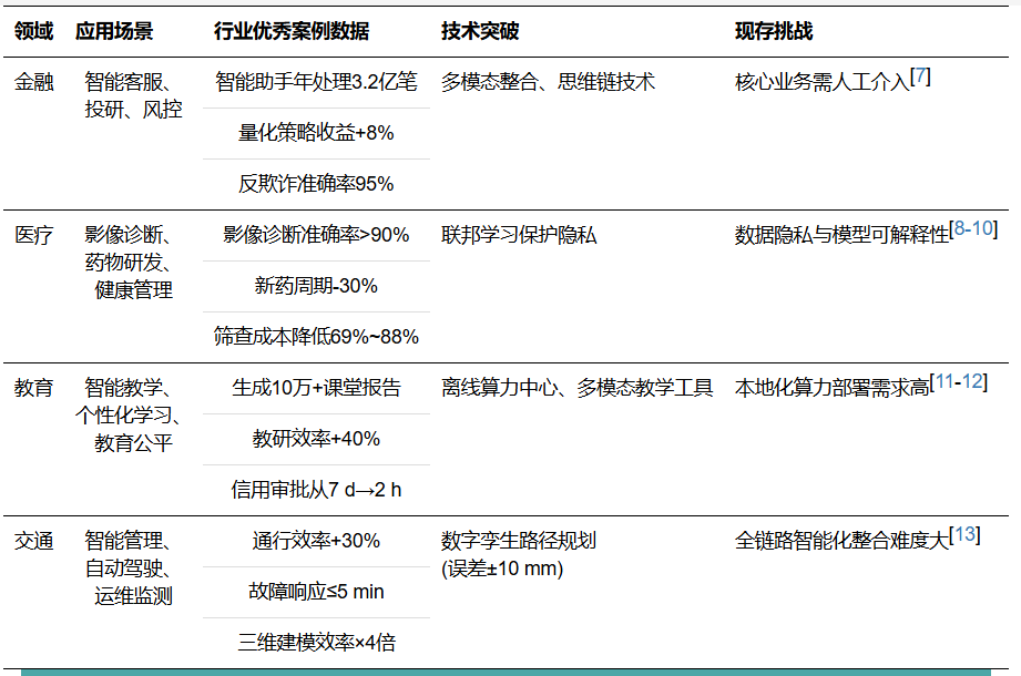 當(dāng)前,AI大模型已在金融、醫(yī)療、教育、交通等領(lǐng)域?qū)崿F(xiàn)深度滲透,展現(xiàn)出顯著的產(chǎn)業(yè)價(jià)值與技術(shù)潛力。如表1所示,在金融領(lǐng)域,智能客服與風(fēng)控系統(tǒng)的高效運(yùn)作體現(xiàn)了多模態(tài)整合與思維鏈技術(shù)的成熟應(yīng)用,但核心決策仍依賴人工。醫(yī)療領(lǐng)域通過聯(lián)邦學(xué)習(xí)等技術(shù)突破,在影像診斷、藥物研發(fā)等方面取得成果,但數(shù)據(jù)隱私與模型可解釋性仍是關(guān)鍵瓶頸。教育領(lǐng)域依托離線算力中心與多模態(tài)工具,實(shí)現(xiàn)教學(xué)效率躍升,而本地化算力需求成為規(guī)模化應(yīng)用的制約因素。交通領(lǐng)域借助數(shù)字孿生技術(shù)顯著提升運(yùn)維效率,但全鏈路智能化整合仍需突破。