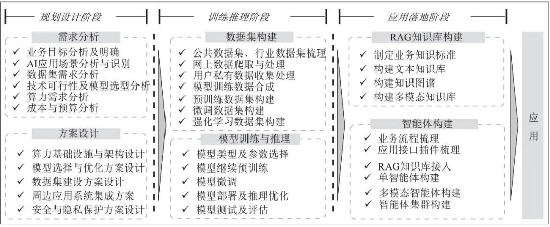 AI工程化整體流程涵蓋規(guī)劃設(shè)計(jì)、訓(xùn)練推理和應(yīng)用落地三個(gè)階段(如圖1所示)。在規(guī)劃設(shè)計(jì)階段,首要關(guān)注企業(yè)戰(zhàn)略和業(yè)務(wù)目標(biāo)選擇,圍繞全鏈路規(guī)劃展開需求分析,包括業(yè)務(wù)目標(biāo)分析、AI應(yīng)用場(chǎng)景分析、數(shù)據(jù)需求分析、技術(shù)可行性及算力需求分析等。同時(shí),基于AI原生(AI Native)的系統(tǒng)方案設(shè)計(jì)強(qiáng)調(diào)業(yè)務(wù)需求理解、數(shù)據(jù)治理、模型優(yōu)化與部署以及監(jiān)控與運(yùn)維的重要性,遵循以AI為核心、數(shù)據(jù)優(yōu)先、持續(xù)學(xué)習(xí)與迭代、自適應(yīng)與個(gè)性化等設(shè)計(jì)原則。在訓(xùn)練推理階段,針對(duì)通用AI大模型存在的“有幻覺、成本高”等問題,行業(yè)、領(lǐng)域AI大模型成為落地“人工智能+”的有效手段,企業(yè)需根據(jù)自身情況選擇開發(fā)L1行業(yè)模型或L2場(chǎng)景模型,并依托成熟工具平臺(tái)支撐數(shù)據(jù)集工程交付能力,同時(shí)注重模型體系設(shè)計(jì)與選擇、訓(xùn)練及調(diào)優(yōu)以及推理優(yōu)化及評(píng)估等關(guān)鍵環(huán)節(jié)。在應(yīng)用落地階段,智能體應(yīng)用為AI大模型應(yīng)用落地提供技術(shù)化手段,通過構(gòu)建檢索增強(qiáng)生成(Retrieval-Augmented Generation,RAG)知識(shí)庫解決私域數(shù)據(jù)利用及實(shí)時(shí)性問題,同時(shí)智能體構(gòu)建的技術(shù)方法手段多樣,包括通過開發(fā)框架直接開發(fā)和基于智能體使能平臺(tái)構(gòu)建應(yīng)用,且智能體全生命周期可觀測(cè)體系和集群全生命周期管理體系為企業(yè)AI應(yīng)用的穩(wěn)定運(yùn)行和持續(xù)優(yōu)化提供保障。