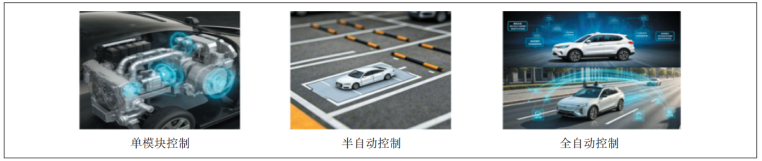 智能網(wǎng)聯(lián)汽車的技術(shù)演進(jìn)歷程一般分為3個(gè)階段(見圖4)。第1階段是單模塊控制階段,車輛各個(gè)關(guān)鍵部件如動(dòng)力系統(tǒng)、制動(dòng)系統(tǒng)等都各自配備獨(dú)立的控制模塊,模塊之間協(xié)同性較差,只能實(shí)現(xiàn)基礎(chǔ)、相對(duì)簡單的功能,例如簡單的定速巡航,車輛無法自主應(yīng)對(duì)復(fù)雜路況;第2階段是半自動(dòng)控制階段,部分駕駛?cè)蝿?wù)可以由車輛自動(dòng)完成,例如記憶泊車功能,車輛能夠自動(dòng)識(shí)別停車位并精準(zhǔn)控制轉(zhuǎn)向、速度等完成泊車動(dòng)作,但仍需要駕駛員參與;第3階段是全自動(dòng)控制階段,車輛已達(dá)成真正意義上的高度智能化與自主化。車輛依托自身及周邊環(huán)境多傳感器融合技術(shù)構(gòu)建起全方位、高精度的環(huán)境感知體系,并基于云端智能網(wǎng)聯(lián)平臺(tái)的強(qiáng)大賦能,具備強(qiáng)大的駕駛決策能力,可實(shí)時(shí)調(diào)整行駛策略以應(yīng)對(duì)復(fù)雜多變交通場景,全程無需駕駛員任何干預(yù)。