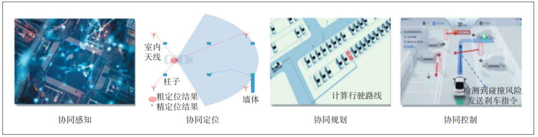典型場景如智慧泊車,通過協(xié)同感知、協(xié)同定位、協(xié)同規(guī)劃和協(xié)同控制等技術(shù)實(shí)現(xiàn)高效、智能的停車管理和服務(wù)(見圖1)。智慧泊車的技術(shù)核心是根據(jù)多源傳感器異構(gòu)算法聯(lián)合感知的異步動(dòng)態(tài)協(xié)同感知系統(tǒng),基于場側(cè)的無線通信技術(shù)和車輛即時(shí)定位與地圖構(gòu)建技術(shù)的協(xié)同定位系統(tǒng),同時(shí)基于先驗(yàn)地圖和實(shí)時(shí)路況的全局路徑調(diào)度和車輛感知的局部軌跡規(guī)劃的協(xié)同系統(tǒng),以及場端原始感知數(shù)據(jù)及預(yù)測(cè)與車輛實(shí)時(shí)規(guī)劃軌跡的實(shí)時(shí)干涉控制系統(tǒng),實(shí)現(xiàn)車路云一體化的泊車服務(wù)。