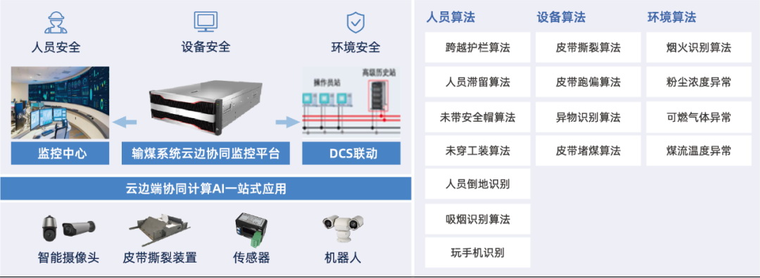 方案通過(guò)云邊端協(xié)同架構(gòu)把智能采集裝置、皮帶撕裂識(shí)別裝置、環(huán)境傳感器等進(jìn)行數(shù)據(jù)的統(tǒng)一匯聚分析,對(duì)異常情況進(jìn)行識(shí)別和報(bào)警,并通過(guò)DCS系統(tǒng)控制聯(lián)動(dòng),提高人員、設(shè)備、環(huán)境的安全管理水平。 在設(shè)備故障監(jiān)測(cè)方面,可對(duì)皮帶異物、落煤口堵煤、皮帶跑偏、運(yùn)行環(huán)境火花等情況進(jìn)行識(shí)別,避免異物運(yùn)輸對(duì)皮帶造成意外損傷或引發(fā)事故;在人員安全管控方面,設(shè)置吸煙、安全帽佩戴、翻越護(hù)欄、人員倒地等相關(guān)算法,對(duì)巡檢人員的不安全行為進(jìn)行識(shí)別管控;在環(huán)境監(jiān)控方面,通過(guò)安裝布設(shè)有毒有害氣體監(jiān)測(cè)傳感器、溫度傳感器、粉塵監(jiān)測(cè)傳感器等對(duì)輸煤環(huán)境進(jìn)行在線實(shí)時(shí)監(jiān)測(cè),及時(shí)發(fā)現(xiàn)高溫、有毒有害氣體超標(biāo)、粉塵濃度超標(biāo)并預(yù)警,最大程度保障人員操作環(huán)境安全。