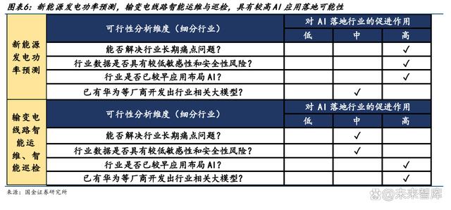 面向行業(yè)主要衡量的維度有: 1) 能否解決長期痛點問題:電網(wǎng)承擔(dān)最主要的功能是維持用電側(cè)與電網(wǎng)側(cè)動態(tài)平衡,而 新能源裝機(jī)比例上升無疑加大了電力調(diào)度與消納的難度,因此若 AI 加持能有效解決 消納相關(guān)細(xì)分環(huán)節(jié)的痛點問題,相關(guān)政策導(dǎo)向和資金投入將有望向此環(huán)節(jié)傾斜。 2) 行業(yè)數(shù)據(jù)是否具有較低敏感性和安全性風(fēng)險:大模型需要通過海量數(shù)據(jù)訓(xùn)練,而電網(wǎng) 行業(yè)本身涉及到民生用電與數(shù)據(jù)安全性問題,部分信息不便用于大規(guī)模公開訓(xùn)練,因 此若某一細(xì)分環(huán)節(jié)數(shù)據(jù)敏感性較低或用戶已授權(quán)使用,則大模型將更快接入落地。 3) 行業(yè)是否已較早應(yīng)用布局 AI/技術(shù)實踐:電網(wǎng)多個應(yīng)用場景較早地應(yīng)用了 AI 技術(shù),例 如輸變電線路運維和巡檢方面,2011 年開始,部分企業(yè)就已開展了通過 AI 對電力設(shè) 備外表缺陷進(jìn)行識別、預(yù)測、跟蹤運行等研究探索。 4) 已有華為等廠商開發(fā)出行業(yè)相關(guān)大模型:例如華為盤古 CV 視覺大模型,已在 L2 級 細(xì)分場景上,推出基于電力大模型的無人機(jī)電力巡檢、電力缺陷識別等場景模型。