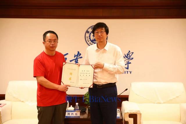 在周鴻祎校友兼職教授授聘儀式上,西安交大校長(zhǎng)張立群為周鴻祎頒發(fā)了聘書,并為他佩戴校徽。