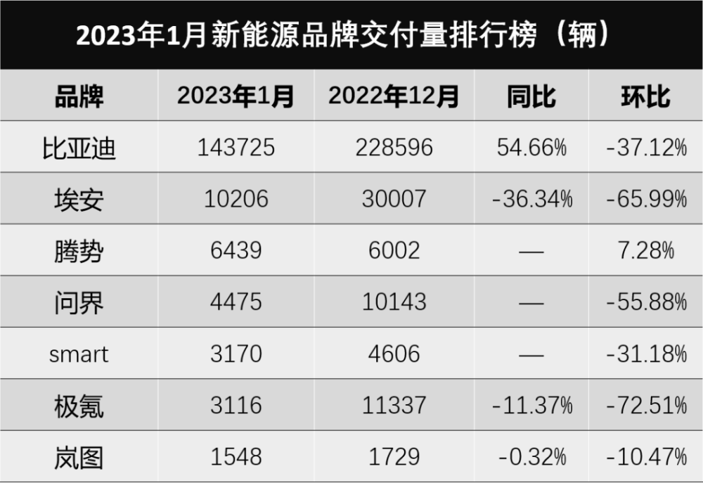 2023年的第一個(gè)月份,各家新能源車企也是準(zhǔn)時(shí)公布了銷量成績(jī),說實(shí)話,基本都不怎么好看,受春節(jié)假期的影響,大部分車型都出現(xiàn)了“腰斬”的現(xiàn)象。