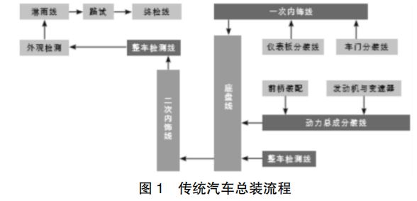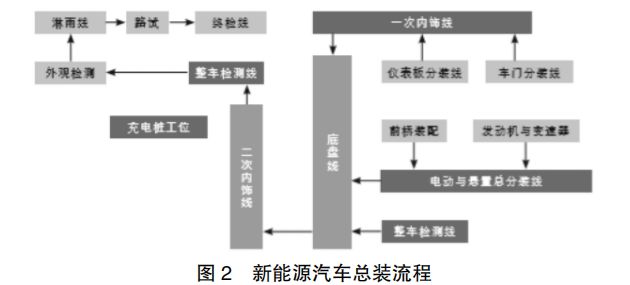 汽車總裝的含義是按照有關(guān)標(biāo)準(zhǔn),將汽車的各個(gè)零部件進(jìn)行合理的組裝和調(diào)配并最終形成完整汽車產(chǎn)品的過程。目前新能源汽車主要以純電動(dòng)汽車為主,因此,本文的新能源汽車主要指純電動(dòng)汽車。傳統(tǒng)汽車的總裝工藝主要包括裝配、檢測、路試、入庫、返修等環(huán)節(jié)。