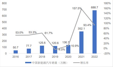 中國是全球最大新能源汽車市場之一,受政府鼓勵和市場推動,我國新能源汽車市場在近幾年得到高速的發(fā)展。根據(jù)中國汽車工業(yè)協(xié)會數(shù)據(jù),2022 年,中國新能源汽車持續(xù)爆發(fā)式增長,銷量達(dá)到 688.7 萬輛,同比分別增長 93.4%,市場占有率達(dá)到 25.6%,逐步進入全面市場化拓展期,迎來新的發(fā)展和增長階段。