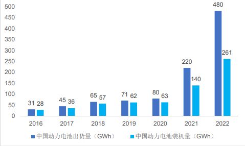 動力電池系新能源汽車的核心設(shè)備之一,直接影響新能源汽車的主要性能指標(biāo)。根據(jù) GGII 數(shù)據(jù),2022 年中國動力電池出貨 480GWh,同比增長 118%;中國動力電池裝機量 261GWh,同比增長 86%。