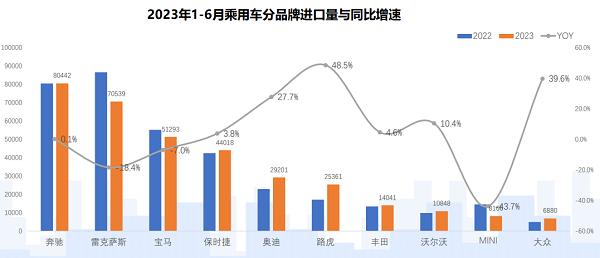 今年上半年,進(jìn)口車前十品牌中,奔馳、保時(shí)捷、奧迪、路虎、豐田、沃爾沃、大眾等七個(gè)品牌實(shí)現(xiàn)正增長(zhǎng);其中,奔馳同比上升0.1%至80442輛,排名第一。而寶馬和MINI,則由于車型國(guó)產(chǎn)導(dǎo)致銷量分別下滑7%和43.7%;雷克薩斯也因?yàn)橹髁囆虴S系列銷量疲軟下滑了18.4%。