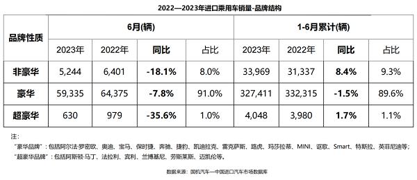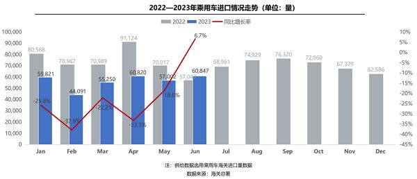 今年6月,我國(guó)乘用車進(jìn)口6.1萬(wàn)輛(含底盤(pán)),同比增長(zhǎng)6.7%;1-6月累計(jì)進(jìn)口33.8萬(wàn)輛,同比下滑23.3%,主要原因?yàn)閲?guó)內(nèi)市場(chǎng)消費(fèi)結(jié)構(gòu)改變及電動(dòng)化轉(zhuǎn)型降低了對(duì)燃油車的需求。銷量方面,6月,進(jìn)口乘用車終端銷售6.5萬(wàn)輛,同比下滑9.1%,環(huán)比增長(zhǎng)6.6%。1-6月,進(jìn)口乘用車?yán)塾?jì)銷售36.5萬(wàn)輛,同比微降0.6%;相比之下,新能源進(jìn)口車銷量同比漲幅接近七成。