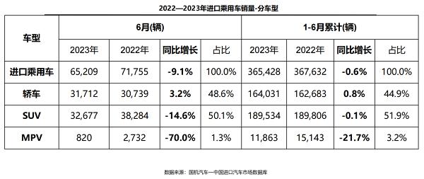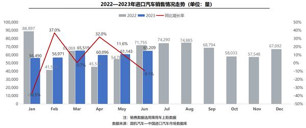 銷量方面,6月,進(jìn)口乘用車終端銷售6.5萬(wàn)輛,結(jié)束了連續(xù)四個(gè)月的增長(zhǎng)態(tài)勢(shì)。同比下滑9.1%,環(huán)比增長(zhǎng)6.6%。1-6月,進(jìn)口乘用車?yán)塾?jì)銷售36.5萬(wàn)輛,同比微降0.6%。