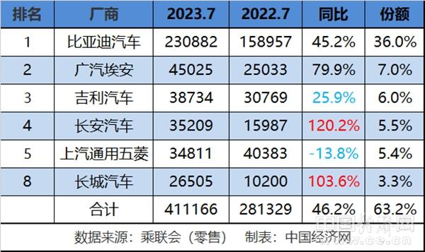傳統(tǒng)新能源延續(xù)著近幾個(gè)月來的競爭格局。7月,6家上榜的傳統(tǒng)品牌合計(jì)銷量達(dá)411166輛,同比增長46.2%;其中,比亞迪、廣汽埃安穩(wěn)居前兩名,吉利、長安、上汽通用五菱、長城銷量均在3萬輛上下。前7月,傳統(tǒng)新能源依然是這6家企業(yè)上榜,合計(jì)銷量超過231萬輛,同比增長59.2%。
