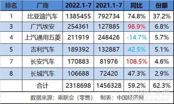 從乘聯(lián)會(huì)發(fā)布的新能源汽車廠商零售銷量TOP10排行榜來看,傳統(tǒng)品牌延續(xù)著近幾個(gè)月來的競爭格局。7月,6家上榜的傳統(tǒng)品牌合計(jì)銷量達(dá)411166輛,同比增長46.2%;其中,比亞迪、廣汽埃安穩(wěn)居前兩名,吉利、長安、上汽通用五菱、長城銷量均在3萬輛上下。前7月,傳統(tǒng)新能源依然是這6家企業(yè)上榜,合計(jì)銷量超過231萬輛,同比增長59.2%。