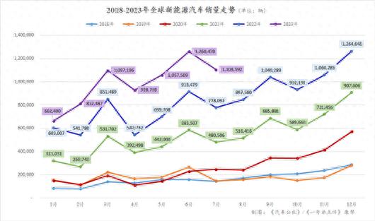 參考?xì)v年來的走勢,可知今年剩下5個(gè)月全球新能源市場的單月銷量應(yīng)該都將保持在110萬輛以上。