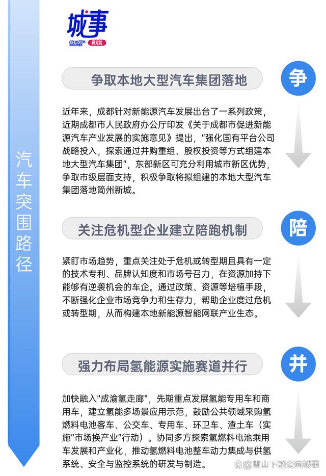 1.爭取本地大型汽車集團落地。近年來,成都針對新能源汽車發(fā)展出臺了一系列政策,近期成都印發(fā)《關于成都市促進新能源汽車產(chǎn)業(yè)發(fā)展的實施意見》提出,“強化國有平臺公司戰(zhàn)略投入,探索通過并購重組、股權(quán)投資等方式組建本地大型汽車集團”,東部新區(qū)可充分利用城市新區(qū)優(yōu)勢,爭取市級層面支持,積極爭取將擬組建的本地大型汽車集團落地簡州新城。