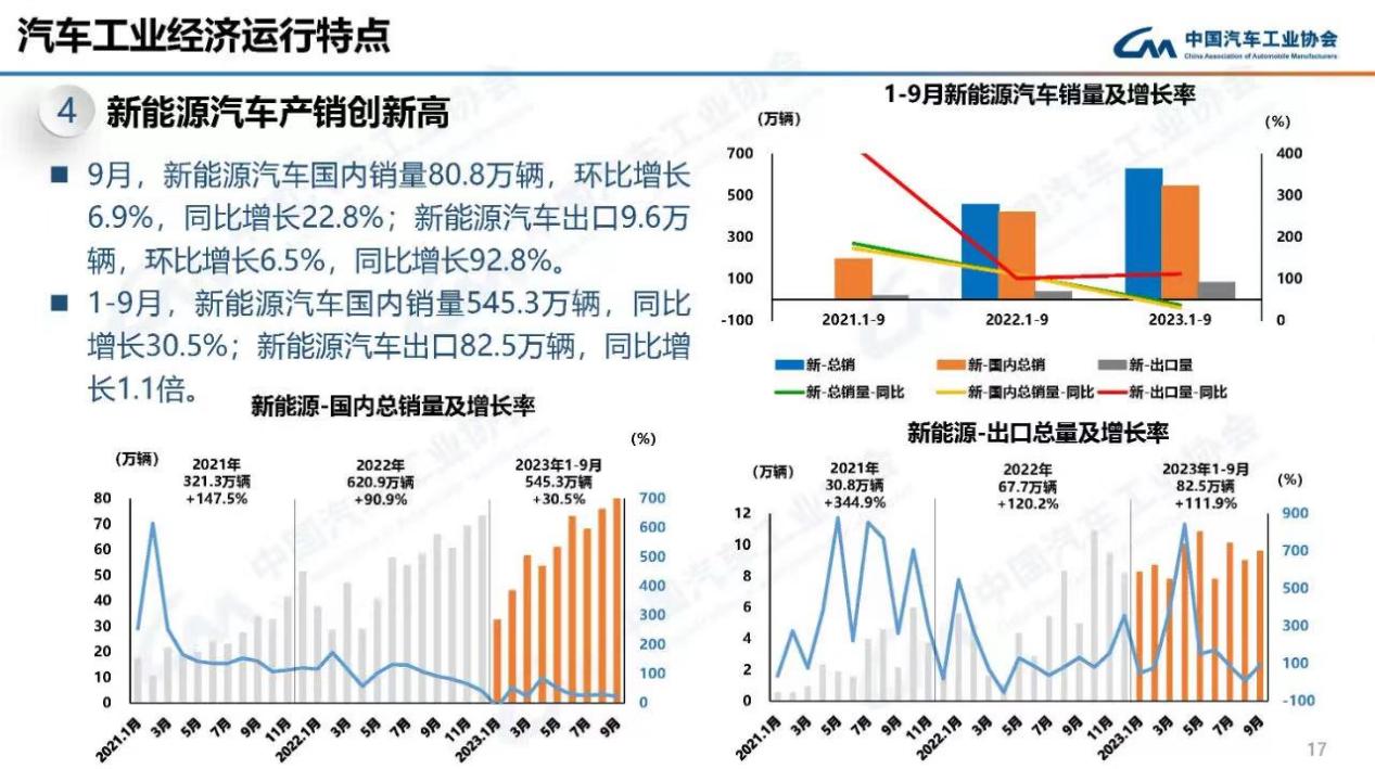今年1月-9月,新能源汽車累計產銷已經達到631.3萬輛和627.8萬輛,同比分別增長33.7%和37.5%,市場占有率達29.8%。而前三季度,新能源汽車國內銷量545.3萬輛,同比增長30.5%;出口量為82.5萬輛,同比增長1.1倍。