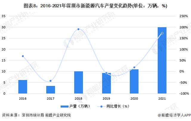 近年來,深圳市新能源汽車產(chǎn)業(yè)發(fā)展迅猛。2018-2020年,深圳市新能源汽車產(chǎn)量維持在9萬輛/年以上,2020年突破了10萬輛;2021年,深圳市新能源汽車產(chǎn)量逼近30萬輛,同比增長(zhǎng)174%;同時(shí),在新能源汽車的有效推廣下,全市公交出租均已實(shí)現(xiàn)電動(dòng)化,2021年全市新能源汽車銷量14.48萬輛,占當(dāng)年汽車銷量比重超40%。