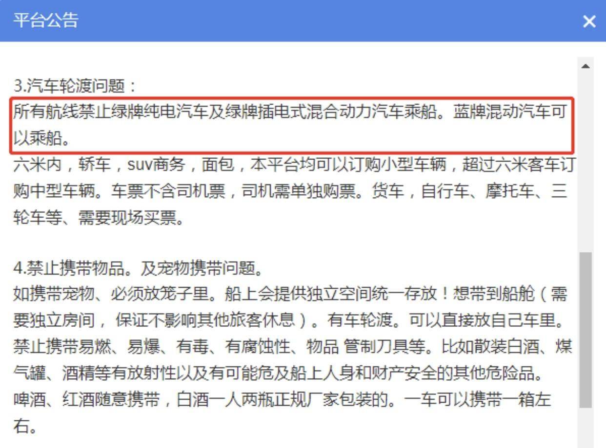 2月20日,頂端新聞致電大連海港官方客服,接線人員回復(fù)確實(shí)有此規(guī)定:“綠牌車、純電車、插電式混合動力綠牌汽車,公司規(guī)定暫時不允許開上輪渡的客貨滾裝船,但藍(lán)牌混動暫無此規(guī)定。”