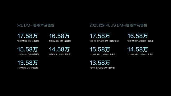 昨晚,搭載比亞迪第五代DM技術(shù)的宋L DM-i及2025款宋PLUS DM-i正式上市。兩款新車各推出5個(gè)版本,官方指導(dǎo)價(jià)均為13.58萬-17.58萬元。