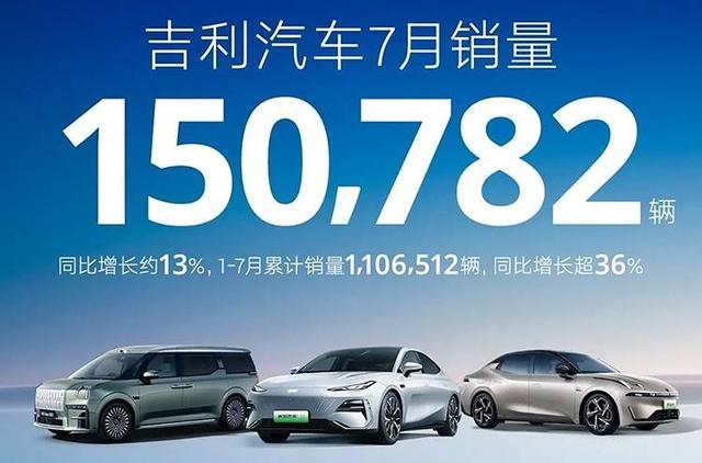 7月,吉利汽車銷量為150782輛,同比增長13%;1-7月累計銷量1106512輛,同比增長超36%。其中,新能源銷量59051輛,同比增長58%;1-7月新能源累計銷量379236輛,同比增長105%。
