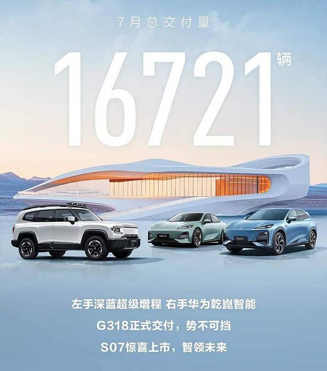 藍汽車官方宣布,7月累計共交付16721輛。在7月份,深藍G318正式開啟交付。深藍S07也迎來上市,該車共推出10款車型,售價區(qū)間為14.99-21.29萬元。