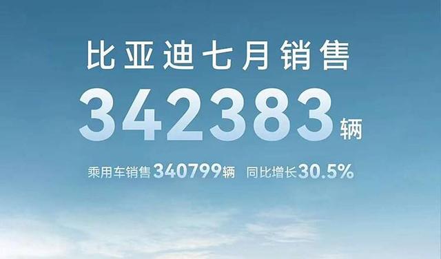 比亞迪官方公布其7月乘用車銷售340799輛,同比增長30.5%,純電車型銷量達130,000輛,插混車型210,799輛。1-7月,比亞迪乘用車累計銷售1,947,944輛,同比增長29.07%。