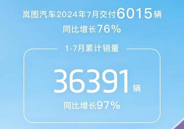 月嵐圖汽車交付6015輛,同比增長76%,1-7月累計交付36391輛,同比增長97%。