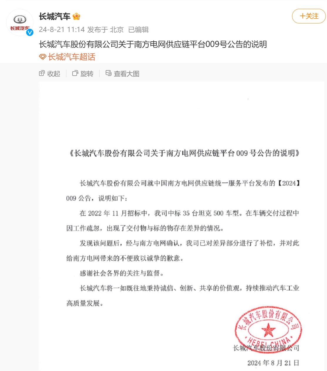 8月21日,長(zhǎng)城汽車發(fā)布關(guān)于南方電網(wǎng)供應(yīng)鏈平臺(tái)009號(hào)公告的說(shuō)明。長(zhǎng)城汽車稱,在2022年11月招標(biāo)中,長(zhǎng)城汽車中標(biāo)35臺(tái)坦克500車型。在車輛交付過(guò)程中因工作疏忽,出現(xiàn)了交付物與標(biāo)的物存在差異的情況。發(fā)現(xiàn)該問題后,經(jīng)與南方電網(wǎng)確認(rèn),長(zhǎng)城汽車已對(duì)差異部分進(jìn)行了補(bǔ)償,并對(duì)此給南方電網(wǎng)帶來(lái)的不便致以誠(chéng)摯的歉意。此前,根據(jù)南方電網(wǎng)發(fā)布的供應(yīng)商處理公告,長(zhǎng)城汽車被南方電網(wǎng)列為“不接受投標(biāo)”的供應(yīng)商。
