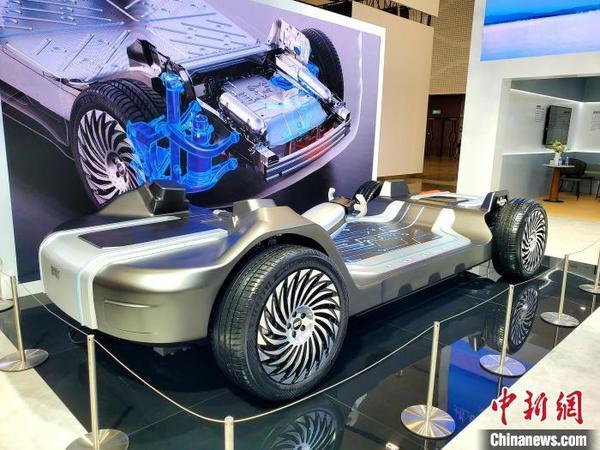 9月27日,為期三天的2024世界新能源汽車大會在??陂_幕。圖為車企在全球新能源汽車產(chǎn)品及技術(shù)展上展示的新能源汽車底盤。中新社記者 王曉斌 攝
