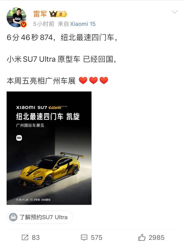 11月12日,雷軍在微博高調(diào)宣布:“小米SU7 Ultra原型車已經(jīng)回國,并將于廣州車展上正式亮相。”據(jù)了解,該車定位為巔峰性能科技轎車,定價為81.49萬元。然而,即便如此,在預訂開啟僅10分鐘內(nèi),小訂量就突破了3680臺。