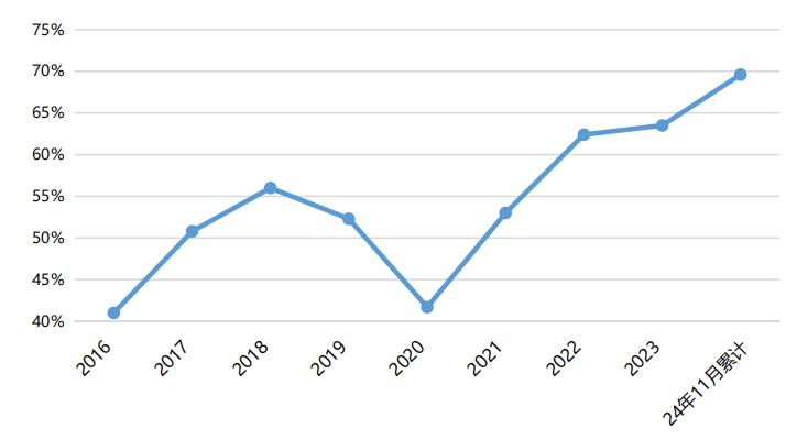 其中,我國新能源車銷售領(lǐng)域在全球的占比,早在2023年就已達到64%的絕對高位;2024年1-11月,我國新能源車銷售領(lǐng)域全球占比繼續(xù)保持69.6%的份額,其中10-11月我國新能源乘用車世界份額更是達到76%。(數(shù)據(jù)來源:Wind、中信建投期貨、乘聯(lián)會,統(tǒng)計區(qū)間:2023.01.01-2024.11.30)