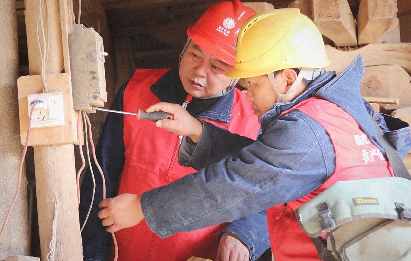 (圖為電力工作人員幫助村民檢查用電線(xiàn)路)