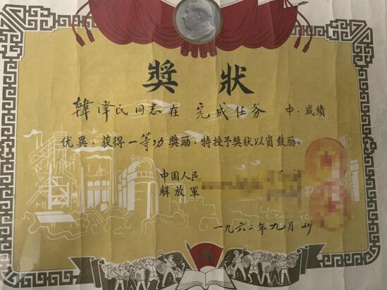 1962年9月,韓澤民榮立一等功的獎(jiǎng)狀