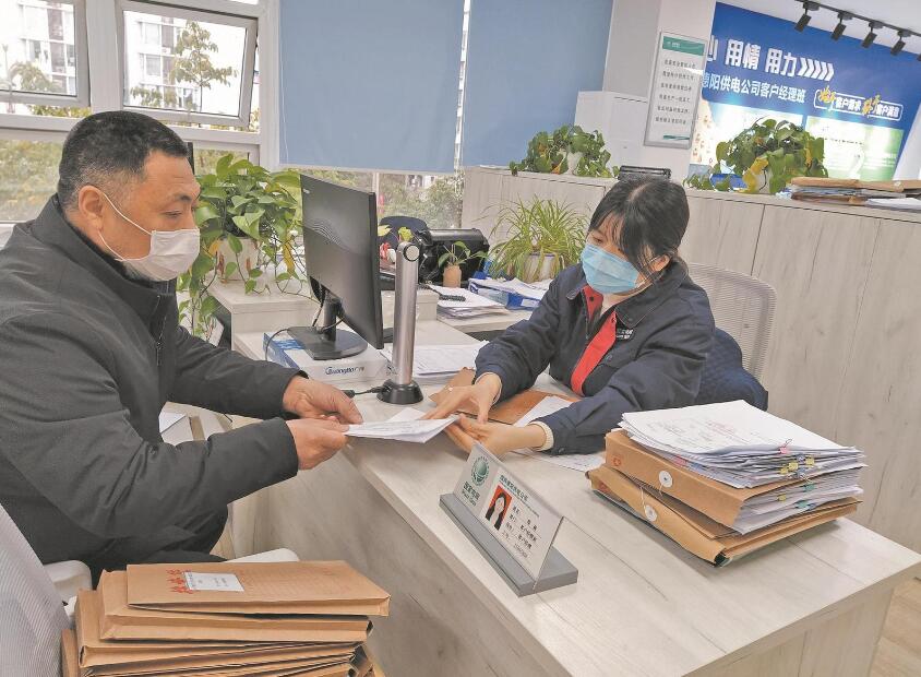鄭燕(右)幫客戶檢查辦理并網(wǎng)業(yè)務(wù)所需的材料。