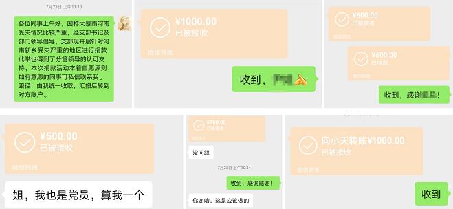 據(jù)悉,河南遭遇特大暴雨,多地發(fā)生嚴(yán)重洪澇災(zāi)害。河南省輝縣市常村鎮(zhèn)氈匠屯村遭受洪澇災(zāi)害,農(nóng)作物受災(zāi),經(jīng)濟(jì)受損,村民們生活與人身安全受到影響。這些天,國網(wǎng)信通產(chǎn)業(yè)集團(tuán)國電通規(guī)劃與計劃管理業(yè)務(wù)事業(yè)部黨支部黨員們每天都留意新聞報道,關(guān)注河南災(zāi)情,希望能為河南做點什么。得知輝縣市常村鎮(zhèn)氈匠屯村受災(zāi)情況后,迅速響應(yīng),通過河南籍員工與當(dāng)?shù)攸h組織取得聯(lián)系,發(fā)出捐款倡議。倡議一經(jīng)發(fā)出,便得到了黨支部黨員、發(fā)展對象和員工的積極參與,迅速募捐到了11800元善款。在輝縣市常村鎮(zhèn)氈匠屯村遭受洪災(zāi)的關(guān)鍵時刻,迅速將善款打給他們,為當(dāng)?shù)匕傩仗峁┰?/p>
