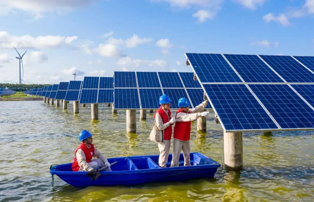 ▲國(guó)網(wǎng)江蘇南通供電公司員工在“漁光互補(bǔ)”光伏電站巡檢光伏發(fā)電設(shè)備。