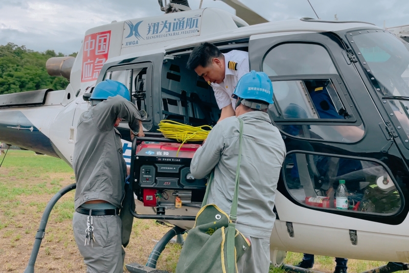 國(guó)網(wǎng)湖南郴州供電公司員工利用直升機(jī)搬運(yùn)發(fā)電機(jī)。