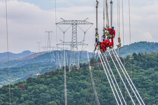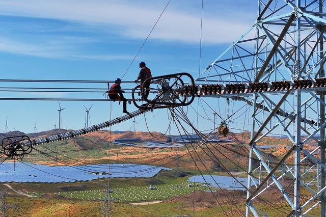 國網(wǎng)寧夏送變電公司施工人員在寧夏—湖南±800千伏特高壓直流輸電工程進行平衡掛線作業(yè)。
