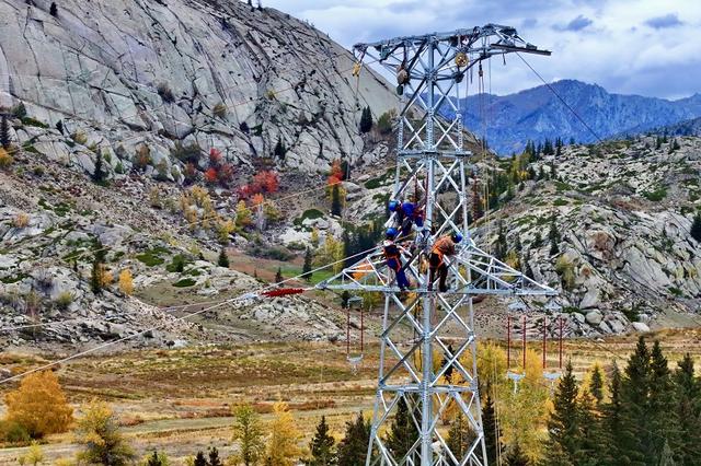 國網(wǎng)新疆阿勒泰供電公司施工人員在110千伏可可托?;﹫鼍€路工程組塔。