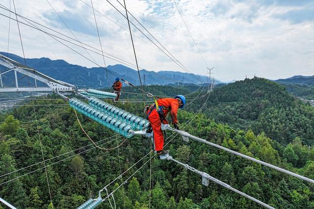 國網(wǎng)浙江送變電公司員工安裝金上—湖北±800千伏特高壓直流輸電線路工程導線間隔棒。