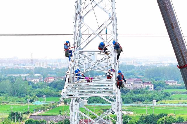 國網(wǎng)江蘇揚州供電公司施工人員在220千伏鳳蜀線路工程立塔作業(yè)。