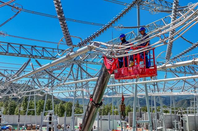 國網(wǎng)北京送變電有限公司施工人員在牌樓500千伏變電站新建工程現(xiàn)場安裝500千伏管母線跳線。
