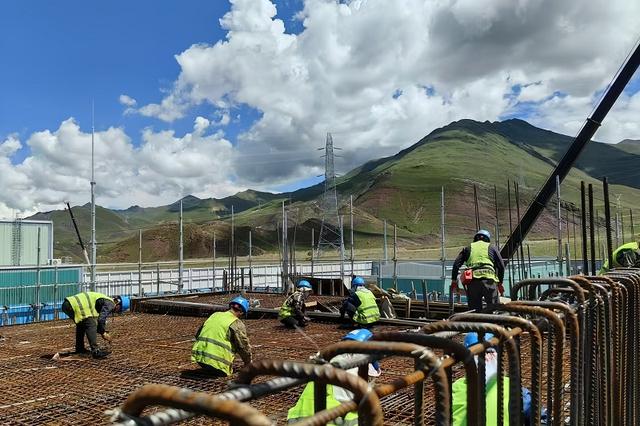 國網(wǎng)河南送變電建設有限公司施工人員在青藏聯(lián)網(wǎng)二期工程±400千伏拉薩換流站開展鋼筋綁扎作業(yè)。