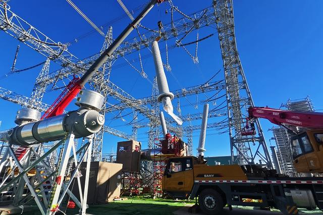 國網(wǎng)遼寧送變電公司施工人員在巴里坤±800千伏換流站開展罐式斷路器安裝作業(yè)。