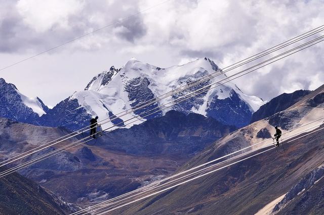 國網(wǎng)青海送變電公司施工人員在玉樹II回330千伏線路工程展放導線。