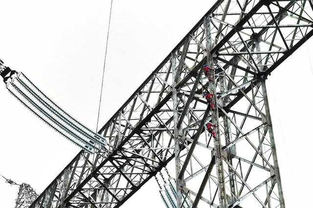 國網(wǎng)四川電力施工人員在川渝1000千伏特高壓交流工程登塔作業(yè)。