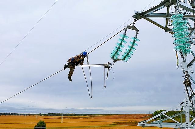 國網(wǎng)甘肅電力施工人員在哈密—重慶±800千伏特高壓直流輸電工程開展架線自檢。
