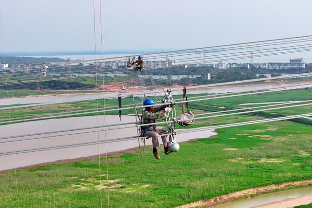 國網(wǎng)江西電力建設公司施工人員在武漢—南昌1000千伏雙回線路工程安裝間隔棒。