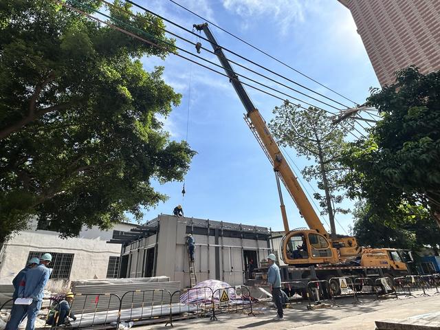 在施工技術(shù)上,江門蓬江供電局不僅引入了自動化挖掘機、起重機、混凝土攪拌車等機械,還摒棄傳統(tǒng)配電站的磚瓦結(jié)構(gòu),采用高強度、輕質(zhì)、耐腐蝕的成品預(yù)制墻板及鋼結(jié)構(gòu)等新型建筑材料,結(jié)合裝配式施工工藝,減少以往現(xiàn)場焊接、切割等工藝帶來的環(huán)境污染,大大縮短了施工周期,還減少建筑垃圾的產(chǎn)生。“與傳統(tǒng)純?nèi)斯な┕し绞较啾?,本工程機械化率達(dá)到85%,工期壓縮了80%,大大減少了對附近居民的影響,也降低了施工過程中的安全隱患。”羅益榮說。