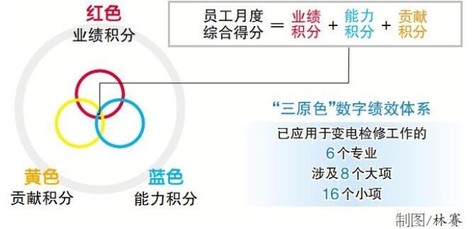 杭州供電公司為適應(yīng)企業(yè)轉(zhuǎn)型升級要求,樹立“工資靠掙、業(yè)績靠干”績效理念,于今年2月8日起在變電檢修中心221名員工績效考核工作中試點應(yīng)用“三原色”數(shù)字績效體系。紅、藍、黃三原色分別代表衡量工作量的業(yè)績積分、衡量工作能力的能力積分和衡量貢獻大小的貢獻積分。其中,業(yè)績積分又分為安全積分和工單積分。每名員工每個月的綜合得分都由該中心的績效管理員基于業(yè)績、能力、貢獻三個維度計算得出,以實現(xiàn)薪酬多勞多得、能者多得。