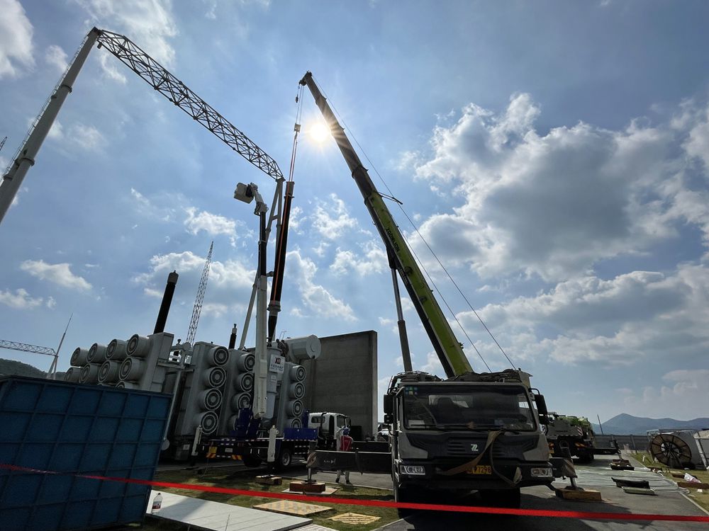 值得一提的是,高中壓套管拉桿更換是此次大修工作的重點(diǎn),高達(dá)14.2米的套管需要兩輛吊車配合吊裝,吊裝工作尤為重要。“變壓器本體排油完成,可以開始吊裝工作!”現(xiàn)場(chǎng)工作人員使用套管安裝專用吊具小心翼翼地將拉桿式結(jié)構(gòu)套管垂直起吊,并在吊裝區(qū)的四個(gè)方向均設(shè)置專人監(jiān)護(hù),隨時(shí)注意吊裝情況。套管落地后,工作人員隨即有序開展瓷瓶探傷、拉桿和紫銅底座的檢查和更換各項(xiàng)工作,現(xiàn)場(chǎng)有條不紊,各方人員團(tuán)結(jié)一致,力爭(zhēng)縮短變壓器器身暴露空氣時(shí)間,嚴(yán)格按照相關(guān)工藝要求進(jìn)行檢查、記錄數(shù)據(jù),最后成功在計(jì)劃時(shí)間內(nèi)完成套管復(fù)裝。